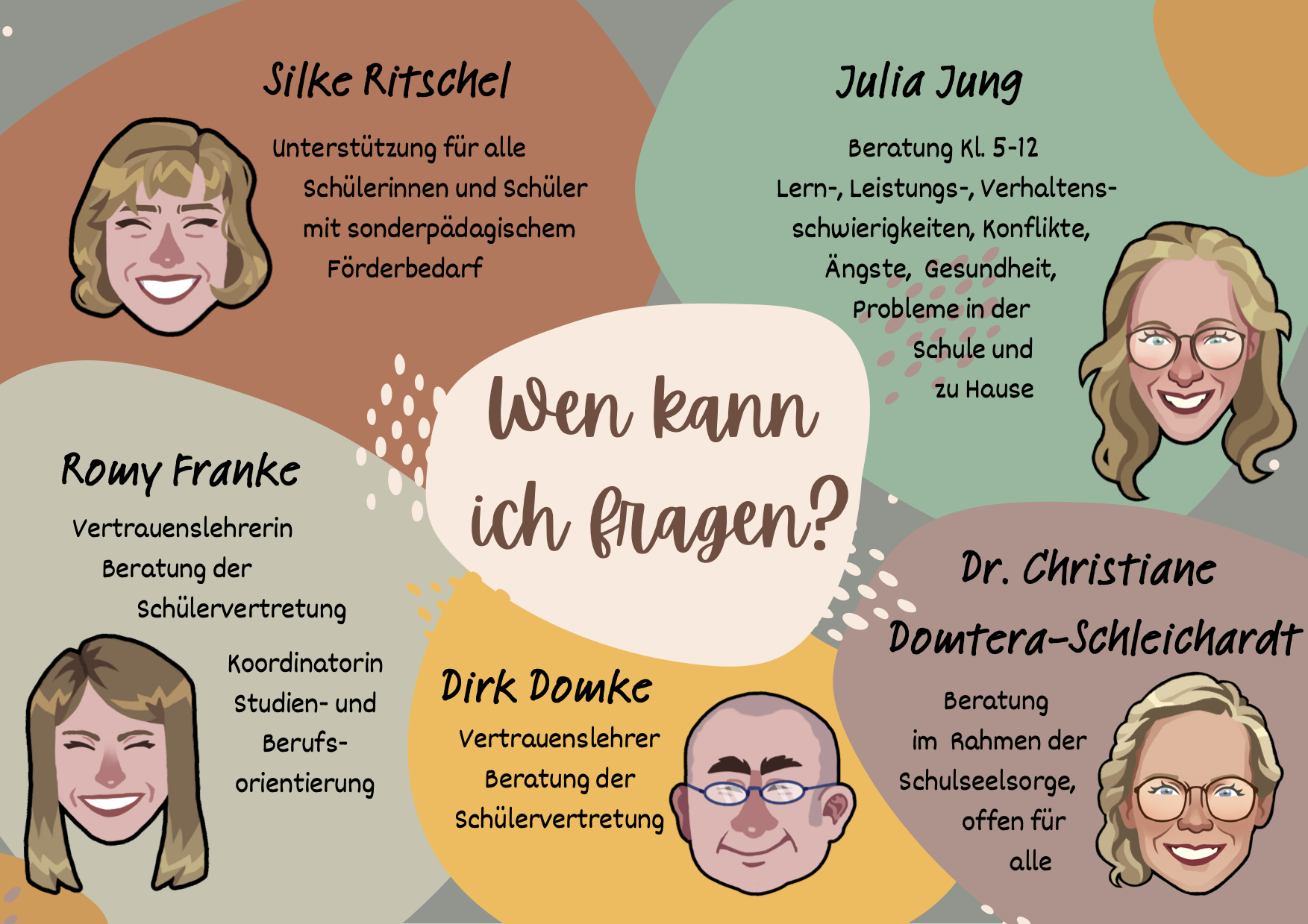 - Frau Ritschel (Stufen 8-12) Beratung bei Lern-, Leistungs- und Verhaltensschwierigkeiten, Unterstützung bei Konflikten, Ängsten, psychischen Krisen, Mobbing, etc.