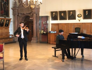 Im Anschluss spielten Georgiy Burkenya ( Violine ) und Dominik Gershkowich (Klavier ) das Stück „Der Schwan“ von Camille Saint Saens. Allen vier Musikern wurde mit lang anhaltendem Beifall für ihre herausragende Leistung gedankt. Diesen Dank möchte ich an dieser Stelle unbedingt an unseren Musiklehrer Simon Leisterer weiterleiten.